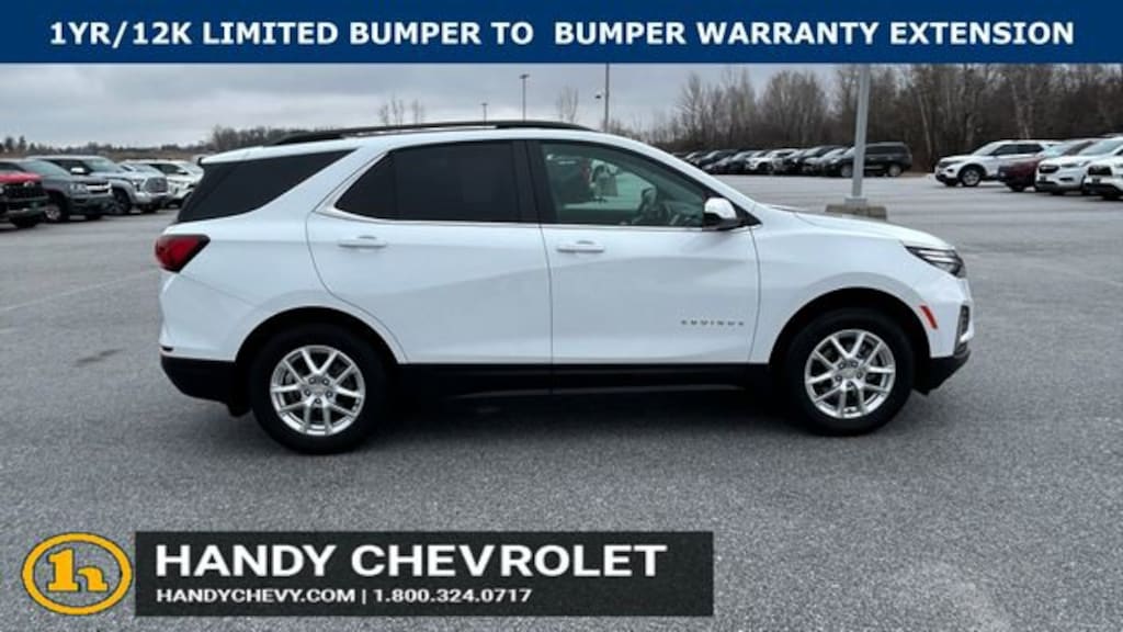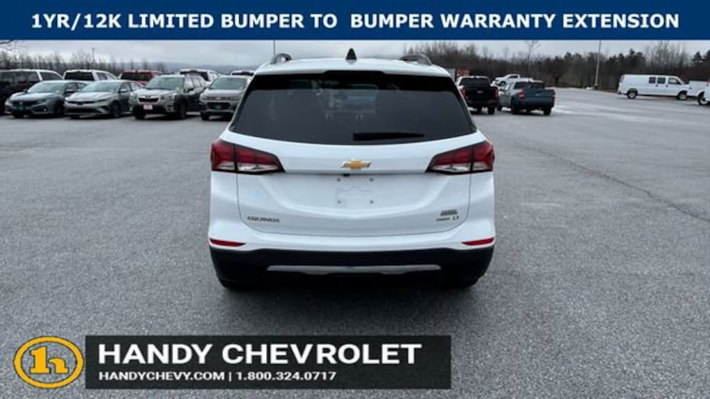 Here at HANDY CHEVROLET, it is our mission to be the automotive home of drivers in the Saint Albans, Burlington, and Franklin County area. We have been a family owned and operated dealership for 50+ years serving our community. We provide a vast selection of new and used vehicles, exceptional car care and customer service with a smile!Our staff at Handy Chevrolet of St. Albans, VT makes every effort to keep all information accurate and up to date. Contact a product specialist on our Sales team to inquire about availability. Contact us as soon as possible at 802 524 9737 to schedule the test drive of your next new or pre-owned vehicle!KEY POLICY: HANDY CHEVY PRE-OWNED VEHICLES COME STANDARD WITH ONE KEY. IF WE RECEIVED MORE THAN ONE KEY FROM THE PREVIOUS OWNER, WE INCLUDE THEM.Odometer is 10308 miles below market average!Clean CARFAX. CARFAX One-Owner.AWD.Certified. Summit White 2023 Chevrolet Equinox LT 4D Sport Utility AWD 6-Speed Automatic Electronic with Overdrive 1.5L DOHC 24/30 City/Highway MPGChevrolet Certified Pre-Owned Details:* 24 months/24,000 miles (whichever comes first) Certified Pre-Owned Scheduled Maintenance Plan and 3 days/150 miles (whichever comes first) Vehicle Exchange Program. SiriusXM 3-month trial subscription.* Limited Warranty: 12 Month/12,000 Mile (whichever comes first) from certified purchase date* Roadside Assistance* Powertrain Limited Warranty: 72 Month/100,000 Mile (whichever comes first) from original in-service date* Warranty Deductible: $0* 172 Point Inspection* Vehicle History* Transferable WarrantyHandy Chevrolet is proud to present you with another True Market Priced Pre-Owned Vehicle. Transparent Pricing Of $ 25524 !! This 2023 Chevrolet Equinox LT Chevrolet Certified Pre-Owned is loaded with the following Factory Options: AWD Confidence & Convenience Package, Driver Confidence II Package (Front & Rear Park Assist), Driver Convenience Package (Dual-Zone Automatic Climate Control, Heated Driver & Front Passenger Seats, Rear Power Liftgate, Remote Start, and Wrapped Steering Wheel), Preferred Equipment Group 1LT, Chevrolet Certified Pre-Owned Certified, AWD, 17 Aluminum Wheels, 2 Rear USB Charging-Only Ports, 2 USB Ports & Auxiliary Input Jack, 2-Way Power Driver Lumbar Control Seat Adjuster, 3.87 Final Drive Axle Ratio, 4-Wheel Disc Brakes, 6 Speakers, 6-Speaker Audio System Feature, ABS brakes, Air Conditioning, Alloy wheels, AM/FM radio: SiriusXM, Auto High-beam Headlights, Bluetooth® For Phone, Brake assist, Bumpers: body-color, Compass, Custom Molded Front & Rear Splash Guards (LPO), Delay-off headlights, Driver 8-Way Power Seat Adjuster, Driver door bin, Driver vanity mirror, Dual front impact airbags, Dual front side impact airbags, Electronic Stability Control, Emergency communication system: OnStar and Chevrolet connected services capable, Four wheel independent suspension, Front anti-roll bar, Front Bucket Seats, Front Center Armrest, Front Passenger 4-Way Manual Seat Adjuster, Front reading lights, Fully automatic headlights, Heated door mirrors, Illuminated entry, Lane Change Alert w/Side Blind Zone Alert, Low tire pressure warning, Occupant sensing airbag, Outside temperature display, Overhead airbag, Overhead console, Panic alarm, Passenger door bin, Passenger vanity mirror, Power door mirrors, Power driver seat, Power steering, Power Sunroof, Power windows, Premium audio system: Chevrolet Infotainment 3, Premium Cloth Seat Trim, Radio data system, Radio: Chevrolet Infotainment 3 System w/AM/FM, Rear anti-roll bar, Rear Cross Traffic Alert, Rear reading lights, Rear seat center armrest, Rear window defroster, Rear window wiper, Remote keyless entry, Roof-Mounted Luggage Rack Side Rails, Security system, SiriusXM Radio, Speed control, Speed-sensing steering, Split folding rear seat, Spoiler, Steering wheel mounted audio controls, Tachometer, Telescoping steering w