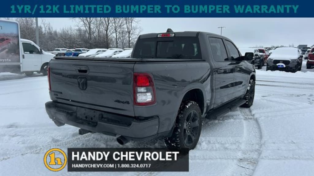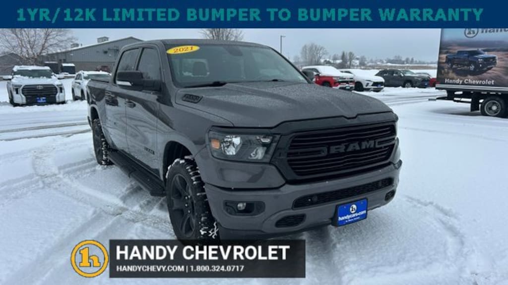 Here at HANDY CHEVROLET, it is our mission to be the automotive home of drivers in the Saint Albans, Burlington, and Franklin County area. We have been a family owned and operated dealership for 50+ years serving our community. We provide a vast selection of new and used vehicles, exceptional car care and customer service with a smile!Our staff at Handy Chevrolet of St. Albans, VT makes every effort to keep all information accurate and up to date. Contact a product specialist on our Sales team to inquire about availability. Contact us as soon as possible at 802 524 9737 to schedule the test drive of your next new or pre-owned vehicle!KEY POLICY: HANDY CHEVY PRE-OWNED VEHICLES COME STANDARD WITH ONE KEY. IF WE RECEIVED MORE THAN ONE KEY FROM THE PREVIOUS OWNER, WE INCLUDE THEM.Clean CARFAX. CARFAX One-Owner.Granite Crystal Metallic Clearcoat 2021 Ram 1500 Big Horn/Lone Star 4D Crew Cab 4WD 8-Speed Automatic HEMI 5.7L V8 Multi Displacement VVTHandy Chevrolet is proud to present you with another True Market Priced Pre-Owned Vehicle. Transparent Pricing Of $ 31998 !! This 2021 Ram 1500 Big Horn/Lone Star is loaded with the following Factory Options: Bed Utility Group (MOPAR Spray In Bedliner and Pick-Up Box Lighting), Big Horn Level 2 Equipment Group (115V Auxiliary Power Outlet, 400W Inverter, and ParkSense Front/Rear Park Assist w/Stop), Night Edition (3 Rear Seat Head Restraints, 4 Way Front Headrests, Anti-Spin Differential Rear Axle, Deluxe Cloth Bucket Seats, Front Seat Back Map Pockets, Rear 60/40 Folding Seat, and Wheels: 20 x 9.0 Premium Paint/Polished), Quick Order Package 25Z Big Horn, 3.21 Rear Axle Ratio, 4-Wheel Disc Brakes, 40/20/40 Split Bench Seat, 48V Belt Starter Generator, 6 Speakers, ABS brakes, Air Conditioning, Alloy wheels, AM/FM radio, Black Exterior Mirrors, Brake assist, Bumpers: chrome, Cloth Bench Seat, Compass, Delay-off headlights, Dome Dual LED Reading Lamp, Driver door bin, Dual front impact airbags, Dual front side impact airbags, Dual-Pane Panoramic Sunroof, Electronic Stability Control, Front anti-roll bar, Front Center Armrest w/Storage, Front fog lights, Front License Plate Bracket, Front reading lights, Front wheel independent suspension, Fully automatic headlights, GPS Antenna Input, Heated door mirrors, Illuminated entry, Integrated Voice Command w/Bluetooth, Leather steering wheel, Low tire pressure warning, Manufacturer's Statement of Origin, Mopar Black Tubular Side Steps, MOPAR Front & Rear Rubber Floor Mats, Occupant sensing airbag, Outside temperature display, Overhead airbag, Overhead console, Overhead LED Lamps, Panic alarm, ParkView Rear Back-Up Camera, Passenger door bin, Passenger vanity mirror, Power door mirrors, Power steering, Power windows, Premium Overhead Console, Radio data system, Radio: Uconnect 3 w/5 Display, Radio: Uconnect 4 w/8.4 Display, Rear anti-roll bar, Rear seat center armrest, Rear step bumper, Rear Underseat Compartment Storage, Remote keyless entry, Remote Start System, Speed control, Split folding rear seat, Steering wheel mounted audio controls, Tachometer, Telescoping steering wheel, Tilt steering wheel, Traction control, Trip computer, Variably intermittent wipers, Voltmeter, and Wheels: 18 x 8 Cast-Aluminum Painted!!